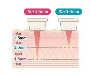 厳密には、深さ1.5mmの「毛穴改善」もありますが、毛穴はフラクショナルレーザー(モザイクリミテッドやエコツーレーザー)のほうが効果が優れているため、深さ4.5mmの「たるみ改善」と、深さ3.0mmの「シワ改善」を使うことが多いです。